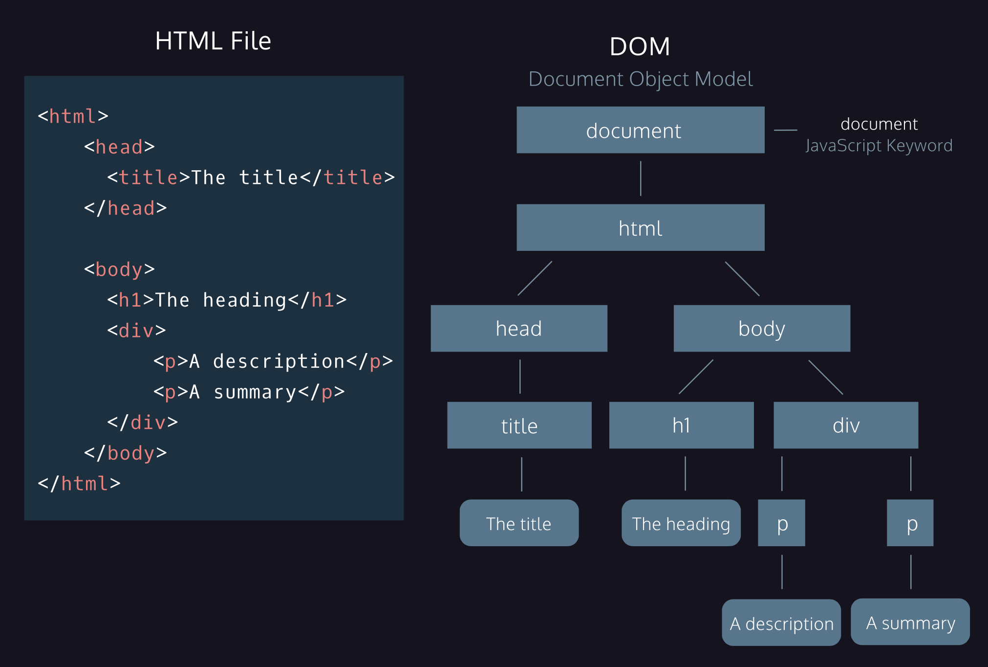 docuemnt.body.innerHTML = "<p>Hello World<p>"document.querySelector('p')document.getElementByID('id').innerHTMLdocument.getElementByClassName('header').innerHTMLdocument.getElementbyID('id).style.color = 'red'.childrenand.parentNodepropertieslet placeholder = document.createElement('p')document.selectedelement.appendChild(placeholder).removeChild(element)and.hidden = true