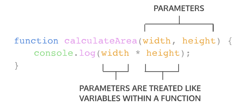A function can be declared using parameters to enable it to receive variables when it gets called. This looks like the following: